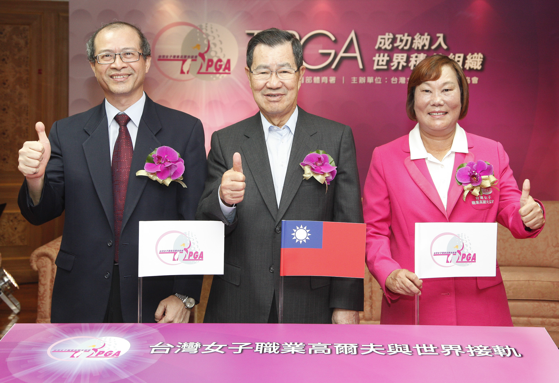 TLPGA成功納入世界積分組織宣布記者會上三位貴賓左起體育署長何卓飛丶前副總統蕭萬長丶TLPGA理事長劉依貞