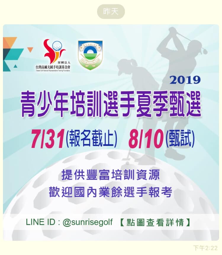 二、協辦單位:揚昇高爾夫鄉村俱樂部(本會訓練中心)、IGOLF高爾夫學院 三、甄選名額:潛力儲訓及長期培訓選手各數名。凡錄取者均須簽訂選手培訓契約。錄取者如轉戶籍至桃園市者,則可代表桃園市城市球隊「桃園揚昇高爾夫球隊」參與各項出賽,享有城市球隊之培訓資源。 (一)資格:凡中華民國國民,品行端正無不良嗜好,並參與過比賽者;且無隸屬球場及接受任何型式贊助培訓者,歡迎國內業餘積分優異者報考。 四、條件: (一)性別:男女不拘 (二)年齡: